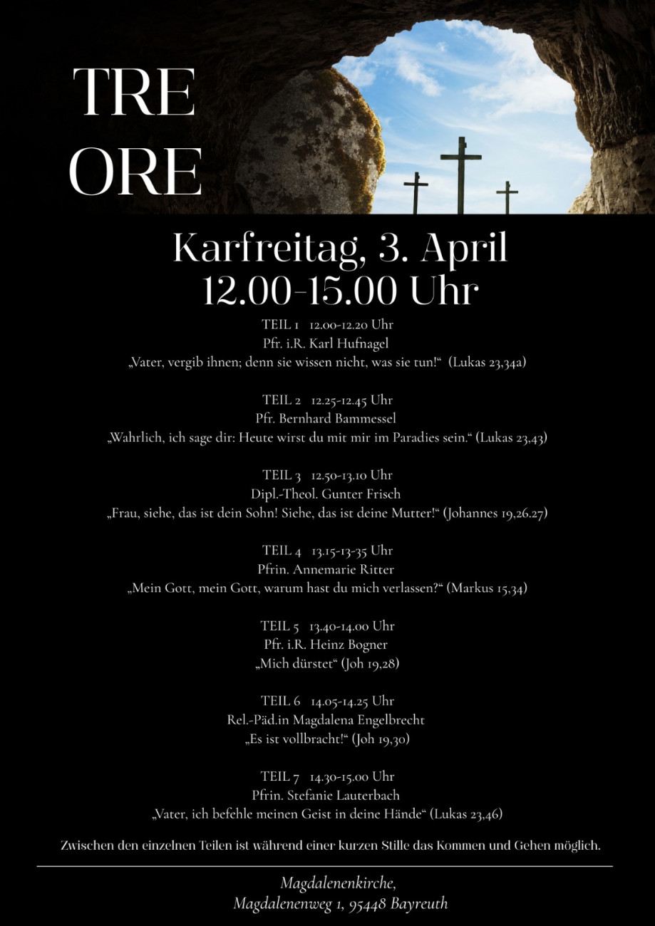 Die Gemeinde St. Johannis bietet neben dem Karfreitagsgottesdienst mit Abendmahl in St. Johannis um 9.00 Uhr mit Pfr. Opitz den Gottesdienst TRE ORE an. Eigentlich 7 Kurzgottesdienste zu den sieben letzten Worten Jesu am Kreuz mit Lesungen, Kurzpredigten und Musik.